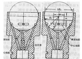 圖1為兩種球塞式內(nèi)曲線(xiàn)液壓馬達(dá)的球塞副,它由一個(gè)階梯柱塞和一個(gè)容納于柱塞大端的鋼球組成。柱塞大、小端直徑之比約為√2。導(dǎo)軌曲面最好能做成適于鋼球滾動(dòng)的滾道槽。鋼球之所以較大,是為了降低導(dǎo)軌曲面的接觸應(yīng)力和柱塞球窩處的比壓。切向力由鋼球經(jīng)柱塞大端傳給缸體,所以球塞馬達(dá)也屬于柱塞傳力類(lèi)型。