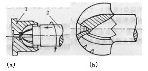 圖2(a)為球形鉸刀鉸削球窩的情形。鉸刀(圖5(b》的切削部分如同一個(gè)半圓球頭,上面開(kāi)有四至六個(gè)刀齒。刀齒的前角為零,后角靠手工操作在工具磨床上沿圓弧刃的后刀面修磨出來(lái)。為了保持刀形的正確,沿刀刃后面留有0.2 -0.3mm的刃帶,此刃帶在鉸削時(shí)還對(duì)工件內(nèi)球面有修光作用。球鉸刀有粗、精之分,粗鉸刀刀齒上開(kāi)有分屑槽,精鉸刀則沒(méi)有。加工時(shí),一般都先用鉆頭在工件上鉆出盲孔,再用成形車(chē)刀粗車(chē)成形,然后粗鉸、精鉸。精鉸時(shí)切削速度比粗鉸圓柱孔時(shí)的切削速度要低。一般v=5~6m/min。鋼件加工時(shí)表面粗糙度為Ra1.6μm。