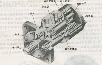 圖4所示的擺線馬達采用配流軸直接配流的方式。.由于配流軸同時又是扭矩輸出軸,結構簡單,其徑向依靠與殼體中心孔的配合定位,輸出軸不能承受一點徑向力,但輸出軸在工作中難免要承受徑向力,徑向力使配流部分與殼體配合面偏心和磨損,將使容積效率下降。同時,傳動誤差也會影響配流精度。
