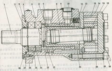 圖3所示的BM型馬達,其輸出軸1通過傳動銷22帶動配流套7旋轉,為防止產(chǎn)生對配流套偏歪,銷22不用剛性聯(lián)接而采用彈簧23將其推入配流套的鍵槽中,因而配流套在輸出軸內(nèi)可浮動,不受徑向力的影響。從而能保證配流套與殼體配合面的同心,可延長使用壽命。但因傳動鏈加長了,需保證機件制造精度才不會使配流精度下降。