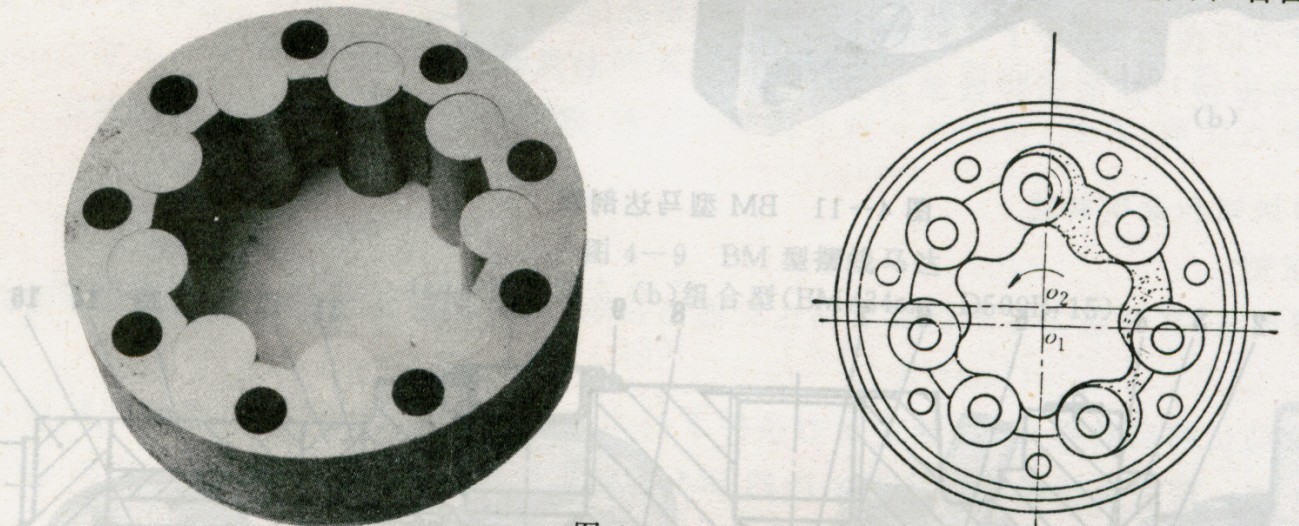 組合式定子是用滾子代替內(nèi)齒環(huán)的圓弧齒形,滾子可在定子中自如地旋轉。工作時位于高低壓腔交界處的滾子被油液壓力壓到低壓方向,使?jié)L子與定子和轉子貼緊,減少了泄漏。并且滾子同轉子一起旋轉,兩齒之間是滾動接觸,所以兩齒輪的磨損很小。這種擺線馬達效率高,壽命長,工作壓力高(可在14MPa下工作,最高工作壓力可達21MPa)。而且定子的工藝并不復雜,幾何精度也易于保證。