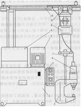 1-油箱;2-電氣控制箱;3-電動機(jī);4-液壓發(fā)生器;5-鉚鉗;6-液壓缸 7-油管;8一懇吊裝置;9-小車;1O-導(dǎo)線