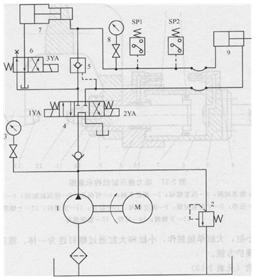 1-定量液壓泵; 2-溢流閥;3、8-壓力表及其開關(guān);4-一位四通電磁換向閥;5-液控單向閥;6–二位四通電磁換向閥;7-增壓器;9-動力液壓缸, SP1、SP2-壓力繼電器