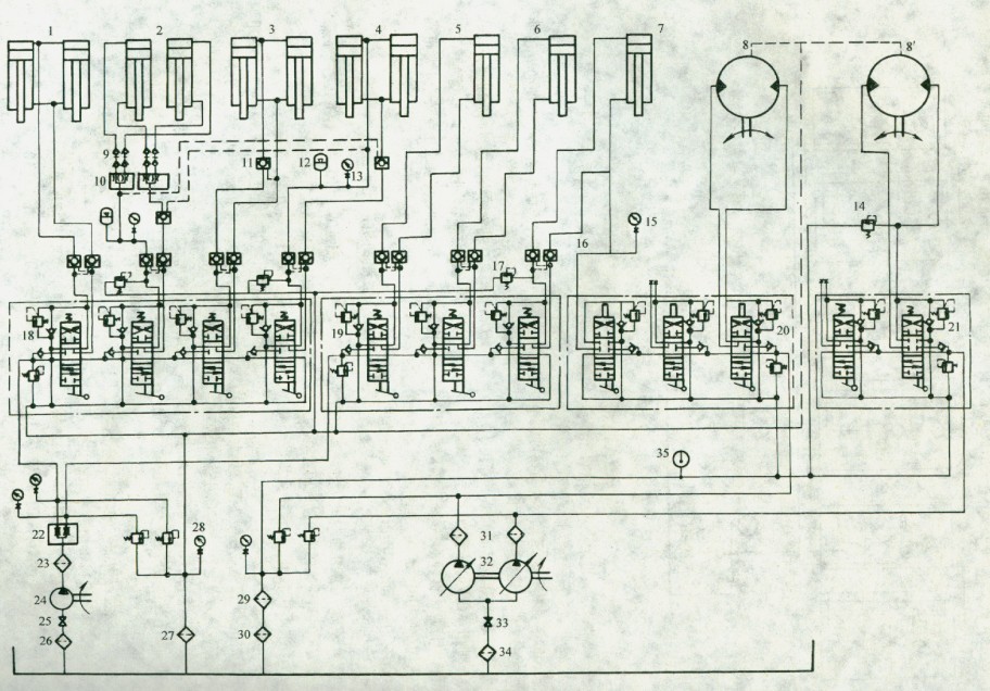該系統(tǒng)動(dòng)力裝置由A8V107變量雙泵32和A2F28定量柱塞泵24組成,為系統(tǒng)提供液壓油源。執(zhí)行器由兩個(gè)液壓馬達(dá)8和7組液壓缸組成。其中,一個(gè)液壓馬達(dá)8為動(dòng)力頭提升裝置,它驅(qū)動(dòng)絞車滾筒,通過鋼絲繩一滑輪組形成倍增傳動(dòng),來升降動(dòng)力頭。另一個(gè)液壓馬達(dá)8’為動(dòng)力頭的旋轉(zhuǎn)驅(qū)動(dòng)裝置,借助行星減速裝置,使動(dòng)力頭獲得3種速度。使用1臺(tái)A2F28液壓泵,通過2組多路閥,分別控制7組液壓缸。為避免干擾,實(shí)現(xiàn)同時(shí)動(dòng)作,采用等量分流閥22,構(gòu)成并聯(lián)流量控制回路。列于回程平穩(wěn)性要求較高的翹舉、起架、拉壓等工作回路,采用平衡閥17保證回路工作的平穩(wěn)性;對(duì)于同步動(dòng)作要求較高的夾持器回路,采用雙向等最分流集流閥10,以達(dá)到雙缸工作始終保持同步的目的。