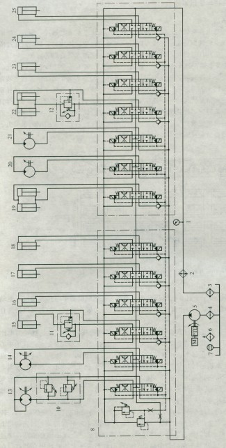 圖2所示為該修補(bǔ)車的電液比例控制液壓系統(tǒng)原理圖。系統(tǒng)由定量葉片泵5(由汽車發(fā)動(dòng)機(jī)經(jīng)變速箱的取力器驅(qū)動(dòng))供油。系統(tǒng)的執(zhí)行器有整車的行走驅(qū)動(dòng)和轉(zhuǎn)向液壓馬達(dá)13和14,壓路機(jī)抬舉液壓缸15,料倉(cāng)門液壓缸16,粑爪液壓缸17、18,廢料箱液壓缸19(2個(gè))、螺旋輸送液壓馬達(dá)20、21,加熱板傾斜(2個(gè))、橫移、升降、旋轉(zhuǎn)液壓缸22~25,共計(jì)13種動(dòng)作功能的15個(gè)執(zhí)行器。這些執(zhí)行器分歸并為兩組并分別采用一組多路換向閥控制,即執(zhí)行器13~18由左側(cè)的多路換向閥8控制,執(zhí)行器19~25由右側(cè)的多路換向閥9控制。兩組多路換向閥均為帶有流量調(diào)節(jié)功能的三位六通電液比例換向閥并采用并聯(lián)油路(各換向閥進(jìn)油口與總的壓力油路相連,各回油口與總的回油口相連),在實(shí)現(xiàn)方向控制的同時(shí),可以實(shí)現(xiàn)各執(zhí)行器的調(diào)速和幾個(gè)執(zhí)行器的同時(shí)動(dòng)作,而閥8中設(shè)置的溢流閥則用于設(shè)定系統(tǒng)的工作壓力,實(shí)現(xiàn)安全保護(hù);液壓泵可以經(jīng)各換向閥的中位油路卸荷;4個(gè)液壓馬達(dá)可通過其換向閥的Y型機(jī)能的中位進(jìn)行補(bǔ)油,以防馬達(dá)制動(dòng)時(shí)吸空。行走驅(qū)動(dòng)馬達(dá)1 3油路設(shè)有溢流閥組10,用于該馬達(dá)的雙向制動(dòng)緩沖;立置的壓路機(jī)抬舉缸1 5和加熱板傾斜液缸22采用單向順序閥1 1、12作平衡閥用,以實(shí)現(xiàn)缸的位置鎖定和下降限速。系統(tǒng)設(shè)有回油冷卻器和回油過濾器,用于系統(tǒng)油液散熱和過濾。