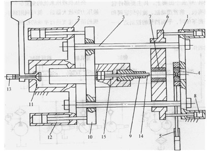 擠壓機的結(jié)構(gòu)示意圖如圖1所示。前梁1、后梁2及張力柱3組成封閉框架。前粱上安置擠壓模4,擠壓模的移動和更換由移模缸5驅(qū)動。擠壓模定位后,固定在穿孔粱6卜的擠壓簡7與擠壓模閉合形成擠壓腔,被擠壓的金屬鑄錠放置在此腔中以待擠壓,穿孔粱由擠壓筒缸8驅(qū)動。擠壓桿9裝于活動梁10上,活動梁10的驅(qū)動是由主缸11和側(cè)缸12共同完成的,側(cè)缸可以完成快速進、退動作,主缸完成擠壓動作,當擠壓桿接近擠壓筒后,慢速將金屬由擠壓??字袛D出,成為一定斷面型的型材或管材。主缸的充液和卸壓由于充液閥缸13驅(qū)動充液閥完成。擠壓管材或有孔的封閉斷面的型材時,需用穿孔針14,由穿孔缸15驅(qū)動,穿孔針可在擠壓桿的的內(nèi)部移動。擠壓機在工作循環(huán)中需要頻繁地變化速度。特別是擠壓桿在擠壓的過程中,對于不同的被加工金屬,在不同的擠壓階段需要有不同的擠壓速度。此外,穿孔針的移動、擠壓缸的移動也需要進行速度控制。