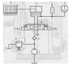 1-定量液壓泵;2-溢流閥;3-單向閥;4-三位四通電磁換向閥; 5-電接點壓力表;6-蓄能器;7-液壓缸;8-丁基膠缸