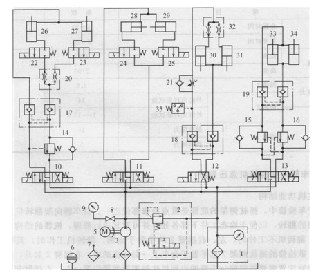1)該機的液壓系統(tǒng)采用變量泵供油,液壓馬達和液壓缸回路分別控制和動作,泵的流量和最高工作壓力按液壓缸的負載壓力和流量確定,液壓馬達的工作壓力通過減壓閥調(diào)節(jié)和保持恒定。系統(tǒng)等待期間,液壓泵可以卸荷,有利于減小功率損失和發(fā)熱。