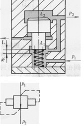 定差減壓閥和定比減壓閥主要用來(lái)和其他閥組成組合閥,如定差減壓閥可保證節(jié)流閥進(jìn)出口間的壓差維持恒定,這種減壓閥和節(jié)流閥串聯(lián)連接組成的調(diào)速閥,其工作原理將在后面提及。圖6-31所示為定比減壓閥的結(jié)構(gòu)原理圖。定比減壓閥的進(jìn)口壓力和出口壓力之比維持恒定。