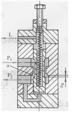 減壓閥也有直動(dòng)式和先導(dǎo)式兩種,每種各有二通和三通兩種形式。圖6-28所示為直動(dòng)式二通減壓閥的工作原理。當(dāng)閥心處在原始位置上時(shí),它的閥a是打開(kāi)的,閥的進(jìn)、出口溝通。這個(gè)閥的閥心由出口處的壓力控制,出口壓力未達(dá)到調(diào)定壓力時(shí)