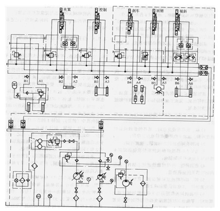 系統(tǒng)中各執(zhí)行回路設計為并聯(lián)回路,各回路單獨或并列間歇動作,又互相不干涉。另外操縱、剎車、平衡和背鉗夾緊各回路都用減壓閥降壓。由此,系統(tǒng)主壓力取決于傾臂液壓缸的推力,并以此作為限壓式變量柱塞泵的壓力設定值,有效地降低了系統(tǒng)的能量消耗,減少油溫升高。