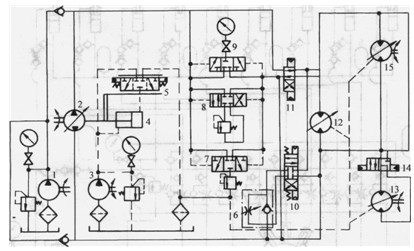 10、11-氣動換向閥12、13、15 -變量液壓馬達14-液壓閥
