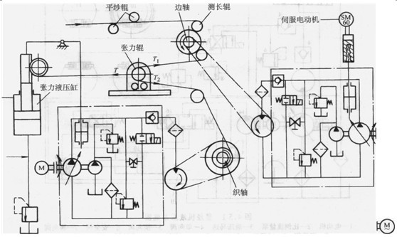 邊軸的轉(zhuǎn)動是通過微電機帶動變量泵的調(diào)節(jié)機構來實現(xiàn)無級變速的,它使?jié){紗速度為3~80m/nun。織軸(卷繞直徑為110~550mm)轉(zhuǎn)動是通過張力液壓缸活塞的動作直接控制變量泵的調(diào)節(jié)機構來實現(xiàn)無級變速的。