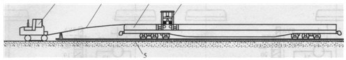 1-鋼軌牽引車;2-待鋪設鋼軌;3-鋼軌專用平車(小車);4-鋼軌助推器;5-鋪設的鋼軌