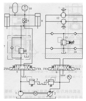 1-定量液壓泵(齒輪泵);2-恒功率變量泵;3、4、13 -溢流閥;5、6-三位四通電磁換向閥;7-單向順序閥;8-加壓液壓缸;9-液控單向閥;10 -電接點壓力表;11-蓄能器; 12-雙向定量液壓馬達;14-單向閥
