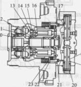 1-調(diào)節(jié)器活塞;2,4-彈簧;3-調(diào)節(jié)器閥;5-馬達(dá)殼體;6-安全吸油閥彈簧;7-安全吸油閥;8-單向閥;9-單向閥彈簧;10 -輸出軸;11-變量斜盤(pán);12-保持架導(dǎo)向塊;13 -銷(xiāo);14-活塞;15 -保持架;16 -油缸;17 -配流盤(pán);18-平衡閥; 19 -環(huán);20-滑閥回位彈簧;21-制動(dòng)活塞;22-摩擦片;23-摩擦盤(pán);24-鋼球