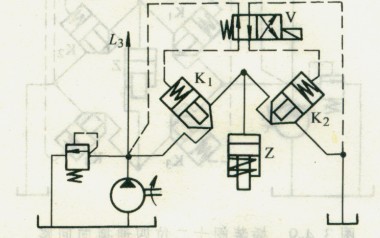 圖3 .4-2中插裝閥K液阻橋路在L1、L2間形成液控單向回路。當(dāng)液控兩位三通換向閥V的控制油口z無油壓輸入時,L1、L2間為單向回路,油液只能由Li單向地流向L2。當(dāng)控制油口z有油壓輸入時,L1、L2之間油液可雙向流動,因而失去單向功能。