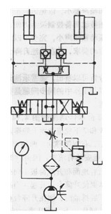 圖5為樂池升降臺液壓系統(tǒng),是原理最簡單,造價最低的一種。樂池升降臺的兩只液壓缸尺寸大小相同是由定量泵供油,利用分流閥(又稱同步閥)來實現(xiàn)兩油缸插塞運動時的同步。因此等量分流閥不管兩液壓缸的活塞桿承受的載荷有何差異,兩活塞桿仍能同步上升,從而保證升降臺剛性平移上升而不會在上升過程巾產(chǎn)生擺動。圖中的兩個液控單向閥可保證在升降臺到達(dá)某要求高度時能穩(wěn)定可靠地被支撐住而不下降。由于兩個液控單向閥在這里起到保壓支承作用,因而必須采用密封性能良好的閥件。換向閥應(yīng)采用H型巾位機能的三位四通電液動換向閥,可保證當(dāng)升降臺停止運動時,液壓缸能在較低的輸出壓力情況下卸載回到油箱。系統(tǒng)中的節(jié)流閥一方面可用來調(diào)整升降臺的速度,另一方面可保證在換向閥處于中位時,控制油路仍有一定的油壓,從而保證換向閥仍能正常換向。此外,采用H中位機能的換向閥,當(dāng)換向閥處于中位時,液控單向閥由于控制口的油壓瞬時下降到零,使閥口得以迅速關(guān)閉,可保證運動部分的可靠鎖緊,實現(xiàn)升降臺準(zhǔn)確停留在任意位置。