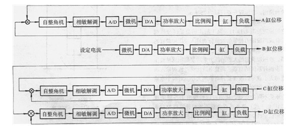 液壓同步提升系統(tǒng)和液壓加載系統(tǒng)用一臺PC工業(yè)控制機控制。其同步提升控制框圖見圖4.14-12。其中B缸為主令液壓缸,它的速度直接給定。由傳感器測得的高差、油壓等模擬信號和缸位置、錨具位置等系統(tǒng)的狀態(tài)參數(shù)輸入給計算機,通過計算機分析,按照預(yù)先編制的控制程序輸出一定的控制電流給各電液比例調(diào)速閥,從而確定A、C、D各缸的速度。負(fù)載位移通過負(fù)反饋反饋到輸入端,形成負(fù)反饋閉環(huán)控制系統(tǒng)。加載控制為開環(huán)控制,負(fù)載大小由預(yù)先輸入到計算機的參數(shù)確定。計算機根據(jù)參數(shù)值輸出相應(yīng)的電流到電液比例溢流閥,從而決定加載力的大小。