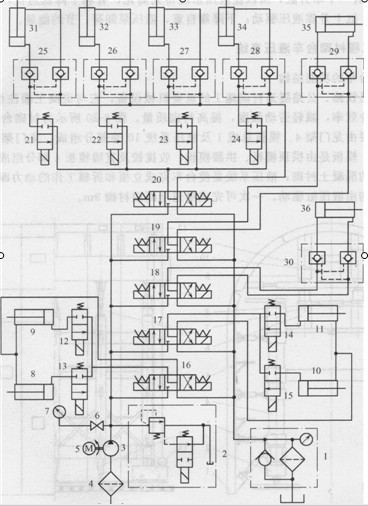 1-回油過濾器;2-電磁溢流閥;3-齒輪泵;4-網式吸油過濾器;5-電動機;6-壓力表開關;7壓力表8、9、10、11-側向液壓缸12、13、14、15、21、22、23、24二位二通電磁換向閥;16、17、18、19、20-三位四通電磁換向閥;25、26、27、28、29、30-雙向液壓鎖; 31、32、33、34-豎向液壓缸;35、36-水平液壓缸