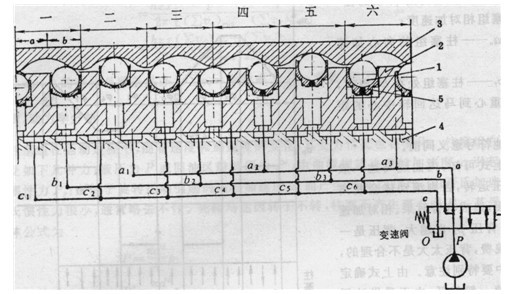 若馬達(dá)的陸面數(shù)為z,將曲面數(shù)為z的導(dǎo)軌分成兩組或多組,實(shí)際上相當(dāng)于將一個(gè)馬達(dá)分成同軸的幾個(gè)馬達(dá)的并聯(lián)組合。用變速換向閥及設(shè)計(jì)成與此相適的配流軸的特殊結(jié)構(gòu)完成變量。變速換向閥可以置于配流軸外的系統(tǒng)管路中,也可以裝在配流軸內(nèi),此時(shí)結(jié)構(gòu)更為緊湊。