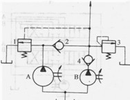 在組合機(jī)床、半自動(dòng)車床等單回路系統(tǒng)中,有時(shí)也采用雙泵。輕載快進(jìn)時(shí),兩泵合流供油,如圖1. 3-8所示。重載慢進(jìn)時(shí)卸荷閥1打開低壓大流量泵A卸荷,高壓小流量泵B單獨(dú)向系統(tǒng)供油,以節(jié)省功率降低溫升。有些油壓機(jī)、注塑機(jī)等也要求快慢速比大,并有一段保壓時(shí)間,則也用雙泵系統(tǒng),在快速時(shí)雙泵供油,慢速及保壓時(shí)單個(gè)小泵供油,以減少功率消耗和溫升。